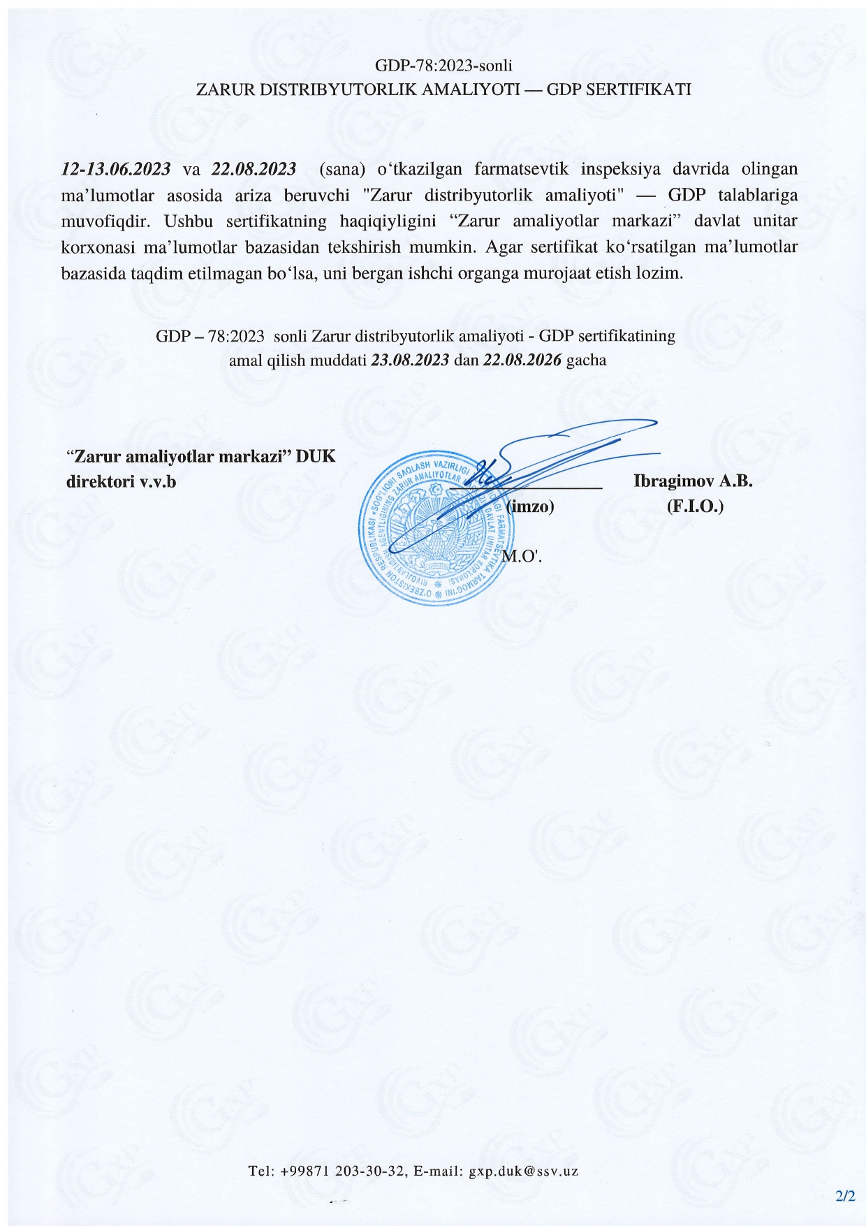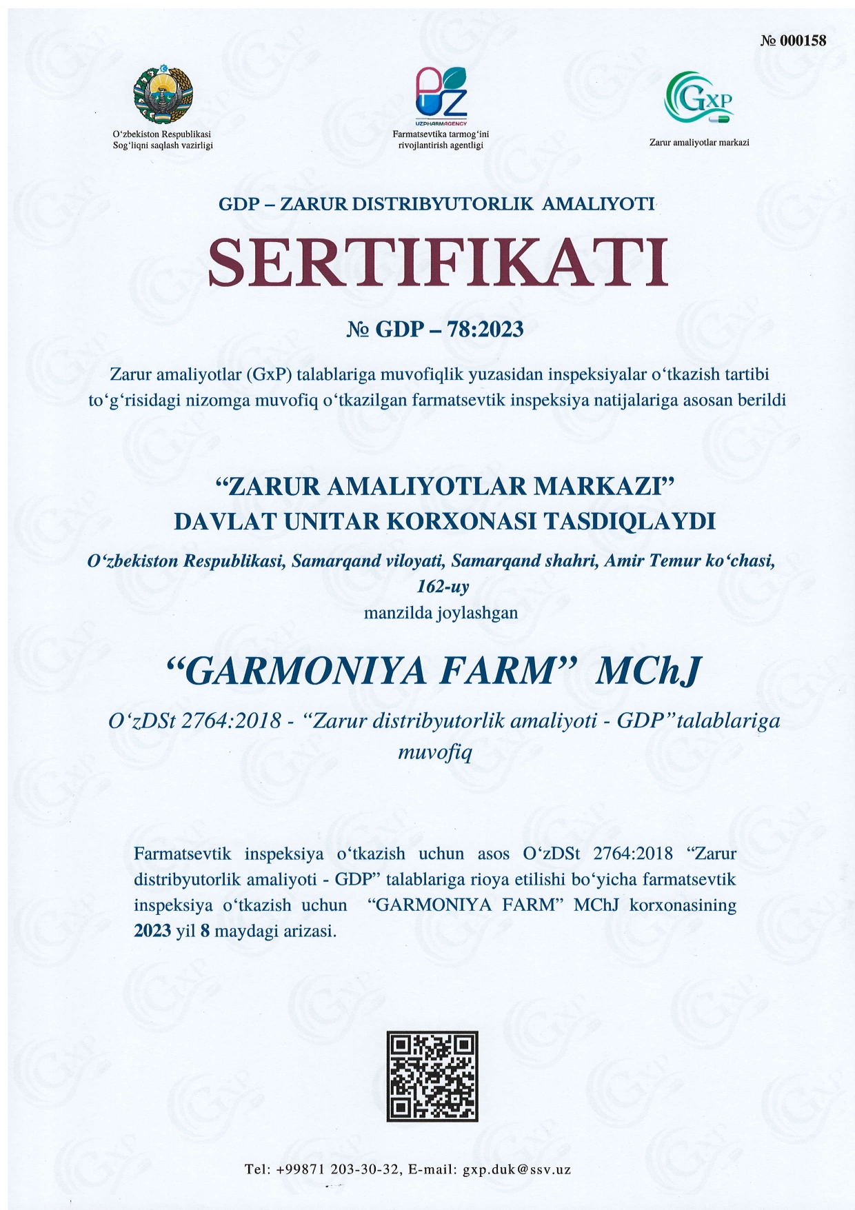 Компания «GARMONIYA FARM» строго соблюдает все требования, предъявляемые к фармацевтическому бизнесу. В 2023 году компания получила сертификат GDP (good distribution practice) – наличие сертификата говорит о соответствии системы управления, квалификации кадров и технической оснащенности складских помещений и грузового транспорта.